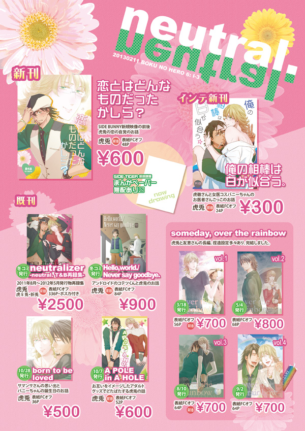 SIDE BUNNYの新規映像の前後談、おじさんがばにーちゃんにラブしてしまってあたふたしているお話な本がでます〜。サンプルはこちら(pixiv)。無配でSIDE TIGERネタのペーパーもだせればよいなと思っております。イベントにお越しの際は、是非お立ち寄りいただけるとうれしいです〜^^
